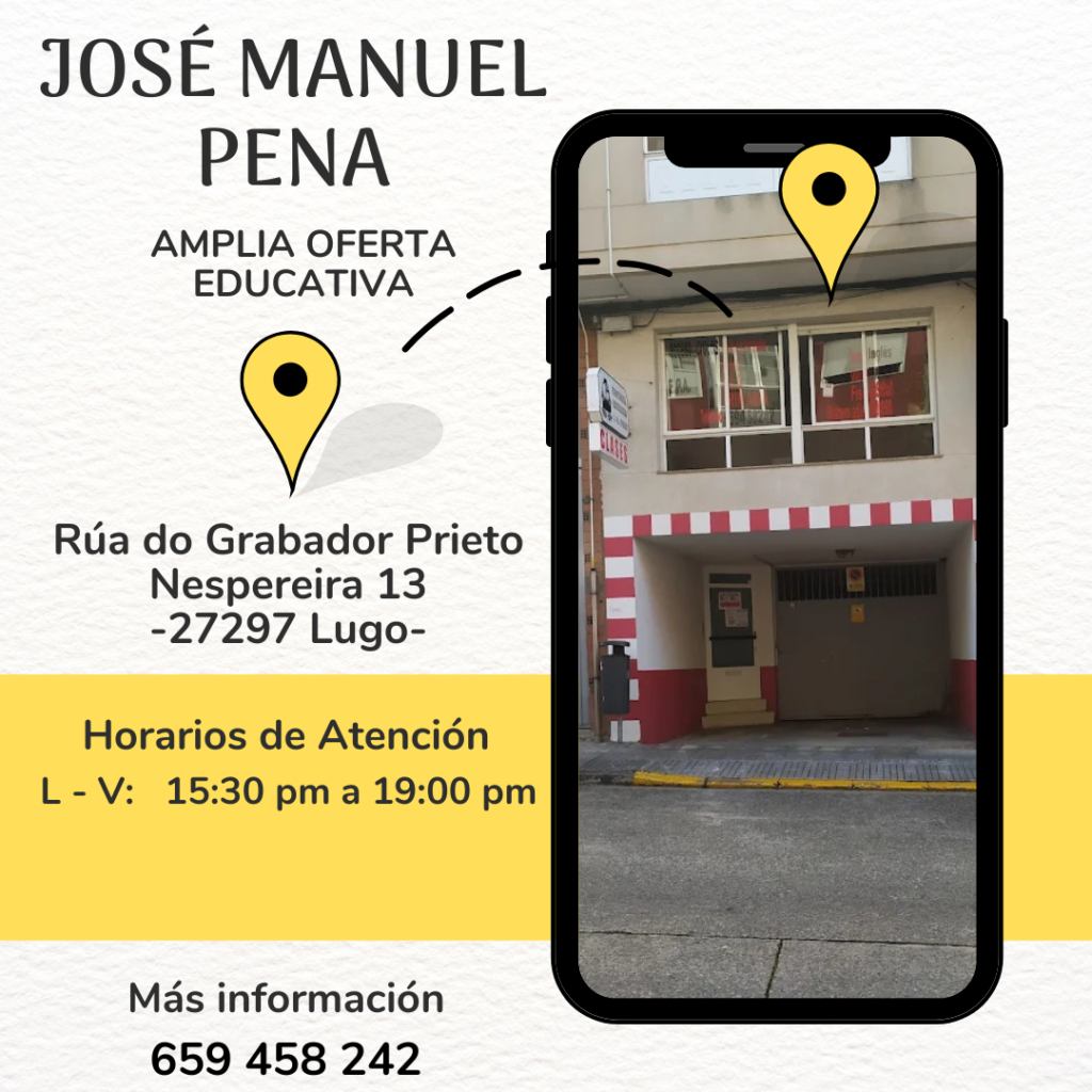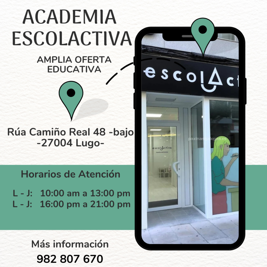 ESCOLACTIVA Lugo | ![]() | ![]() | ![]() | ![]() | ![]() | ![]() | ![]() E.S.A (adultos) | ![]() | ![]() | Rúa Camiño Real 48, bajo Lugo | |