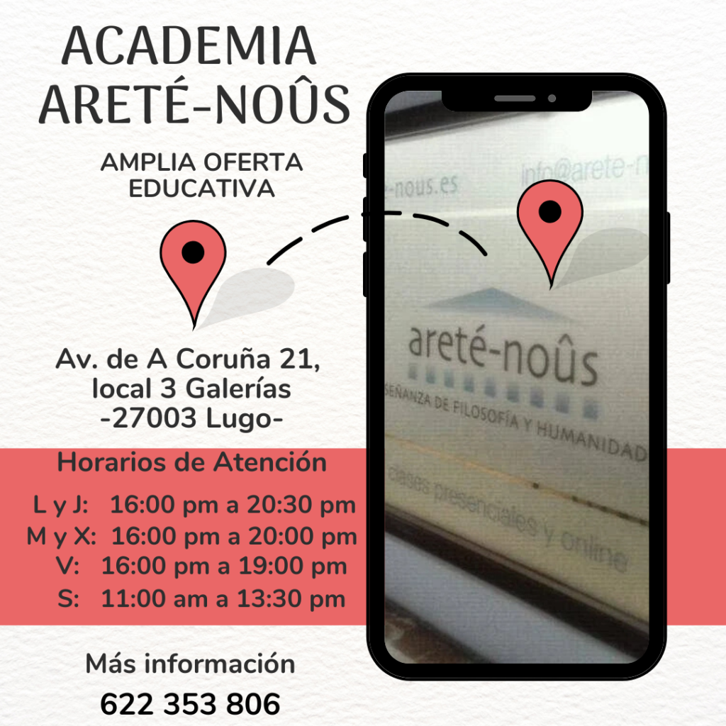 ARETÉ-NOÛS Lugo | ![]() | ![]() | ![]() | ![]() | ![]() | ![]() | ![]() E.S.A (adultos) | ![]() | ![]() | Av. de A Coruña 21, local 3 Lugo | |